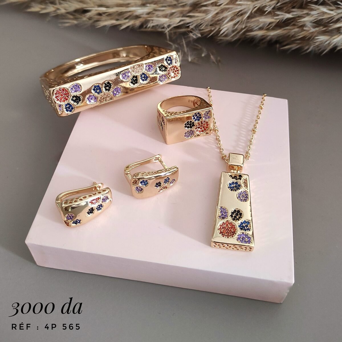 Très belle parure fleur multicolore avec bracelet carré