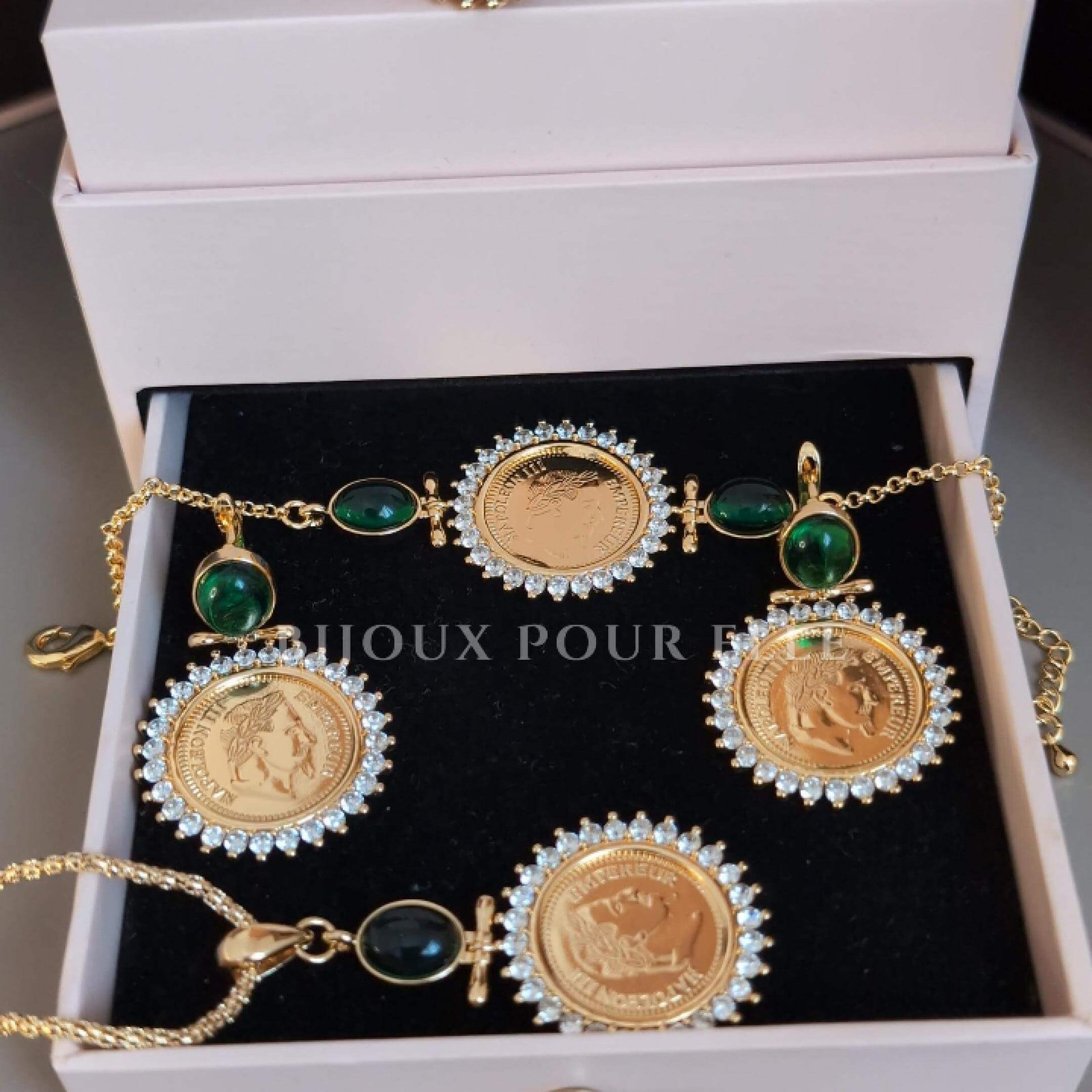 ● Sublime parure Louisa Ornée de pierres Vert Émeraude ❤️ Au style et design très Chic ✨